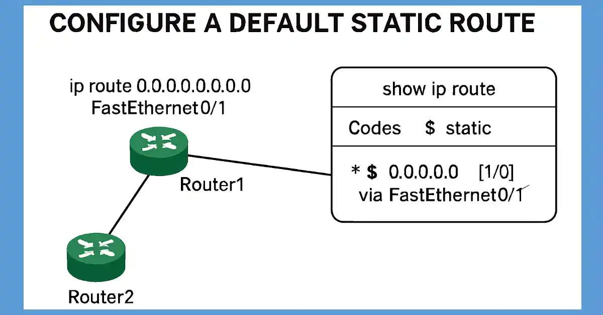 The example in the figure configures a default static route on Router1. So, any packets not matching more specific route entries are forwarded to the exit interface Fast Ethernet 0/1.