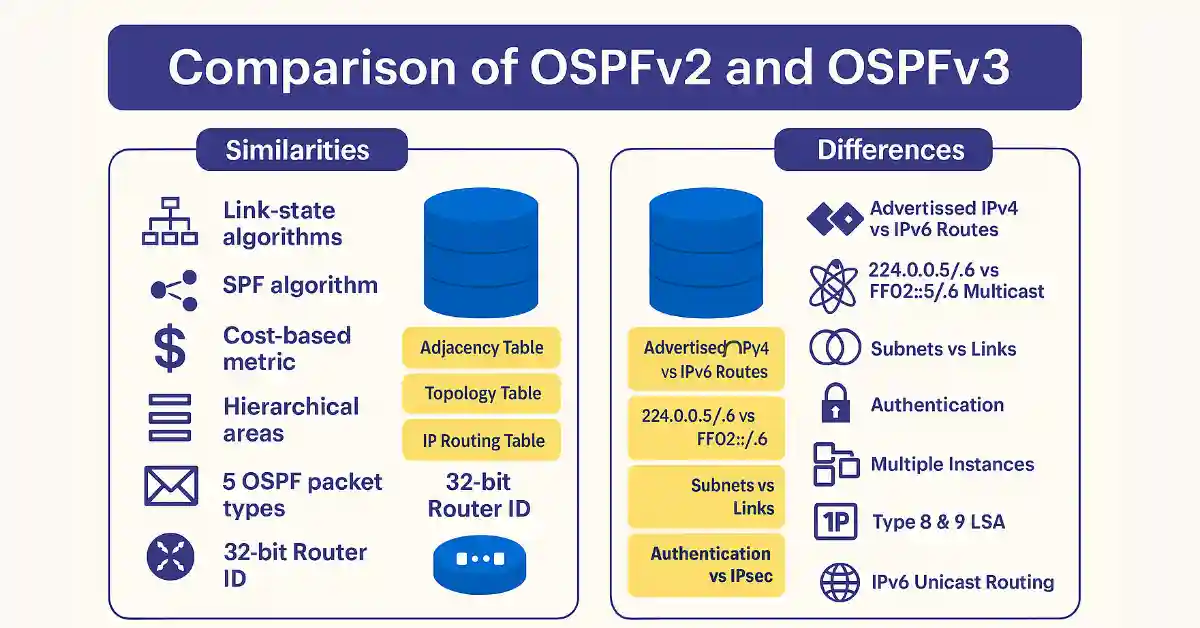 The figure above illustrates the operational differences between OSPFv2 and OSPFv3, showing how each handles routing in their respective IP versions.