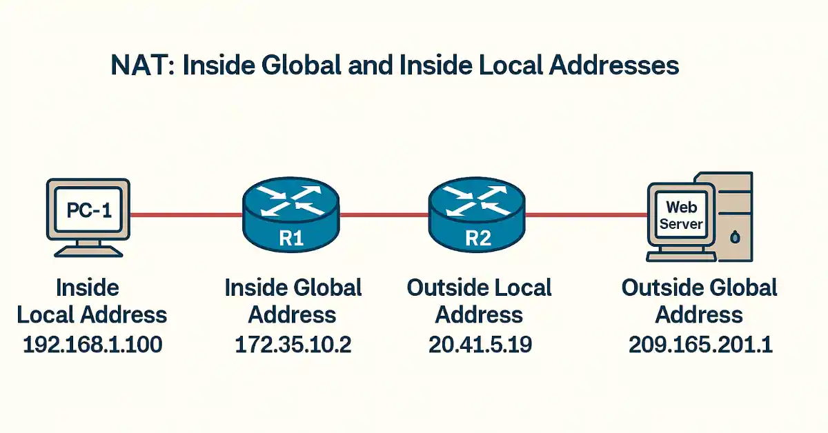 | Outside Global | The real, publicly routable IP address of the destination host on the Internet | On the external server (e.g., web server) | Globally routable | 209.165.201.1 | Ping or traceroute from outside |