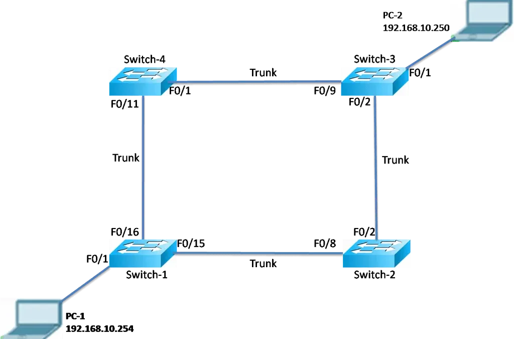 - Due to the broadcast frame, Switch-1 forwards the frame out to all its ports, including both trunks. When the broadcast frame arrives at Switch2 and Switch-4, the switches update their MAC address tables to indicate that PC1 is available on port F0/8 on Switch-2 and F0/11 on Switch-4.