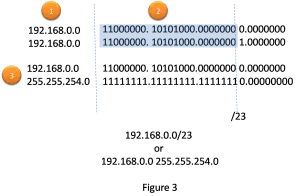 - Count the matching bits from left to right. The matching bits determine the mask for the summary route. As masked, the first 23 far left bits match. This results in the prefix/23 or subnet mask255.255.254.0. Figure 3(2) illustrates the counting of matching bits.