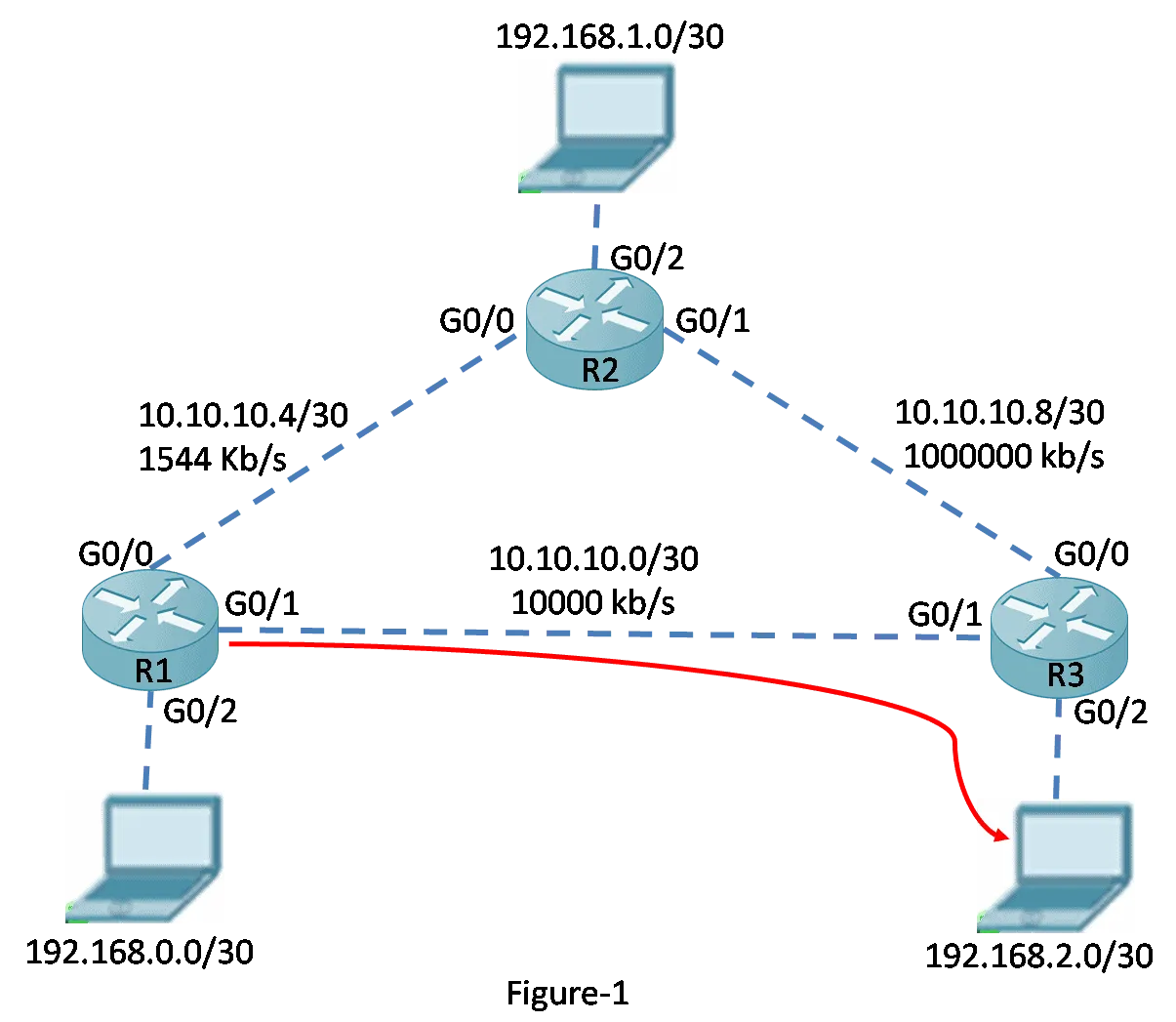 The same outgoing interfaces are used to find out the delay value, as shown in Figure 1. We know that the EIGRP uses the sum of all delays along the path from the source to the destination. The GigabitEthernet interface on R1 has a delay value of 10 usec. The GigabitEthernet 0/2 on R3 has a delay value of 100 usec. The sum of these delays is 110, which is divided by 10 (110/10 = 11).