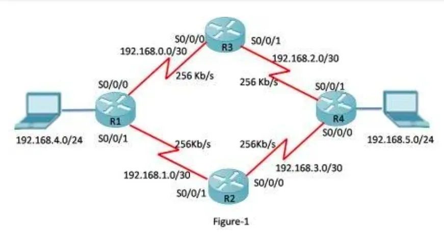 We can verify the EIGRP load balancing using the “show ip protocols” command. The command displays the number of equal-cost paths currently configured on the router. Cisco IOS, by default, allows EIGRP load balancing for four equal-cost path routes. The output in Figure 1 illustrates the topology that we will use in this lesson, and Figure 2 illustrates that R1 is using the default equal-cost EIGRP load balancing.