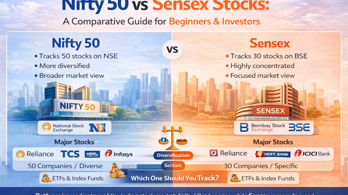 Understanding the Nifty 50 and the Sensex, the two most important barometers in the Indian stock market, is the first step in managing it. Both serve different markets and provide unique views into economic trends, even though they both show the strength of the market. Understanding the difference between the Nifty 50 and the Sensex Stocks List is the first step towards wiser business, regardless of your level of experience.