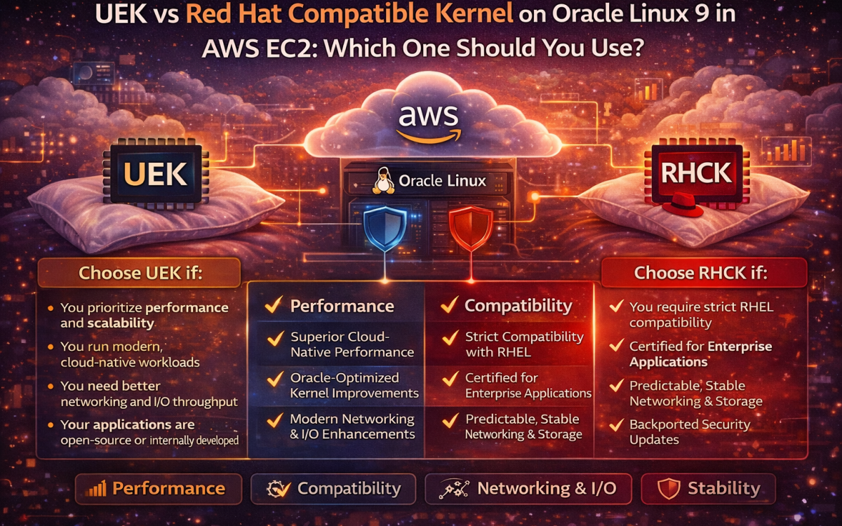 This article provides a deep, technical, and practical comparison of UEK vs RHCK on Oracle Linux 9 in AWS EC2, helping architects, DevOps engineers, and system administrators make an informed decision based on real-world criteria rather than marketing claims.