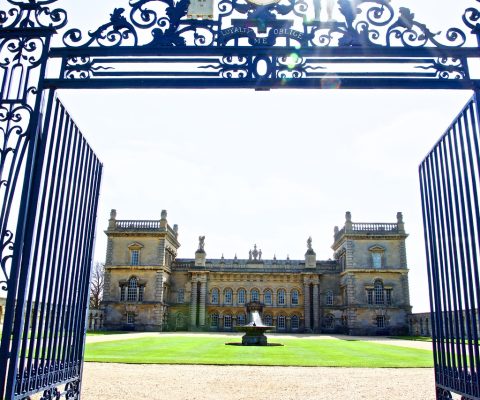 Ornate Wrought Iron Automatic Driveway Gates With Decorative Scrollwork Opening To Historic Estate Mansion With Manicured Lawn