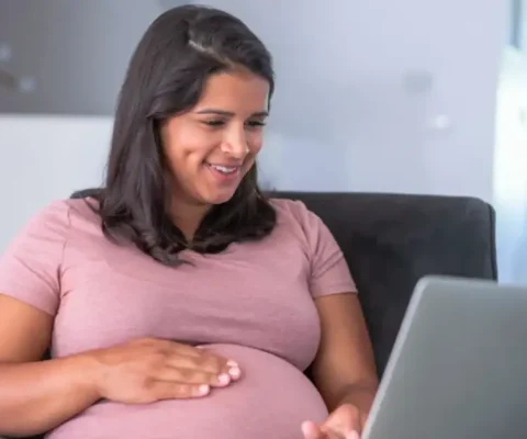 Pregnant Woman Smiling While Working On Laptop At Home With Hand On Baby Bump