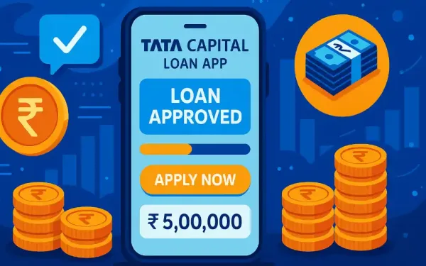 Vibrant Illustration Of A Smartphone Displaying The Tata Capital Loan App Interface With Loan Approval Graphics, Money Icons, And Digital Financial Elements In Blue And Orange Tones.