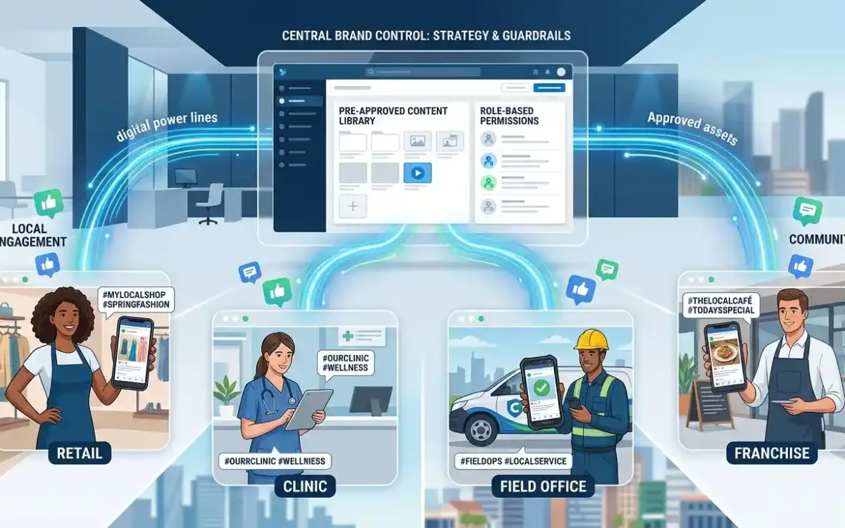 Large organizations with distributed workforces face a unique challenge when it comes to social media. Corporate teams craft polished brand strategies, but the employees closest to customers (frontline staff in retail stores, clinics, field offices, and franchise locations) often lack the tools to execute those strategies at a local level.